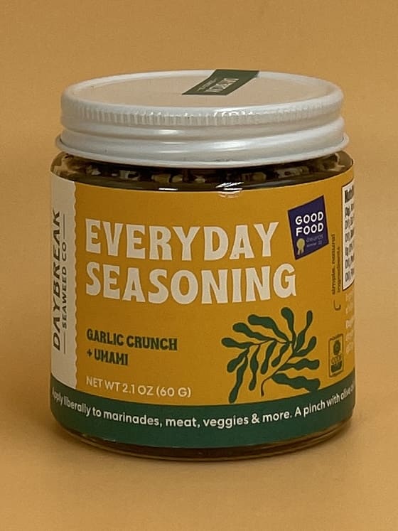 Made with organic seaweed, onions, and garlic, Daybreak Seaweed Co.'s Golden State Seasoning Salt is an award-winning "everything" spice. This nourishing West Coast take on old-school seasoning salts boasts mild heat, umami, and garlic crunch.