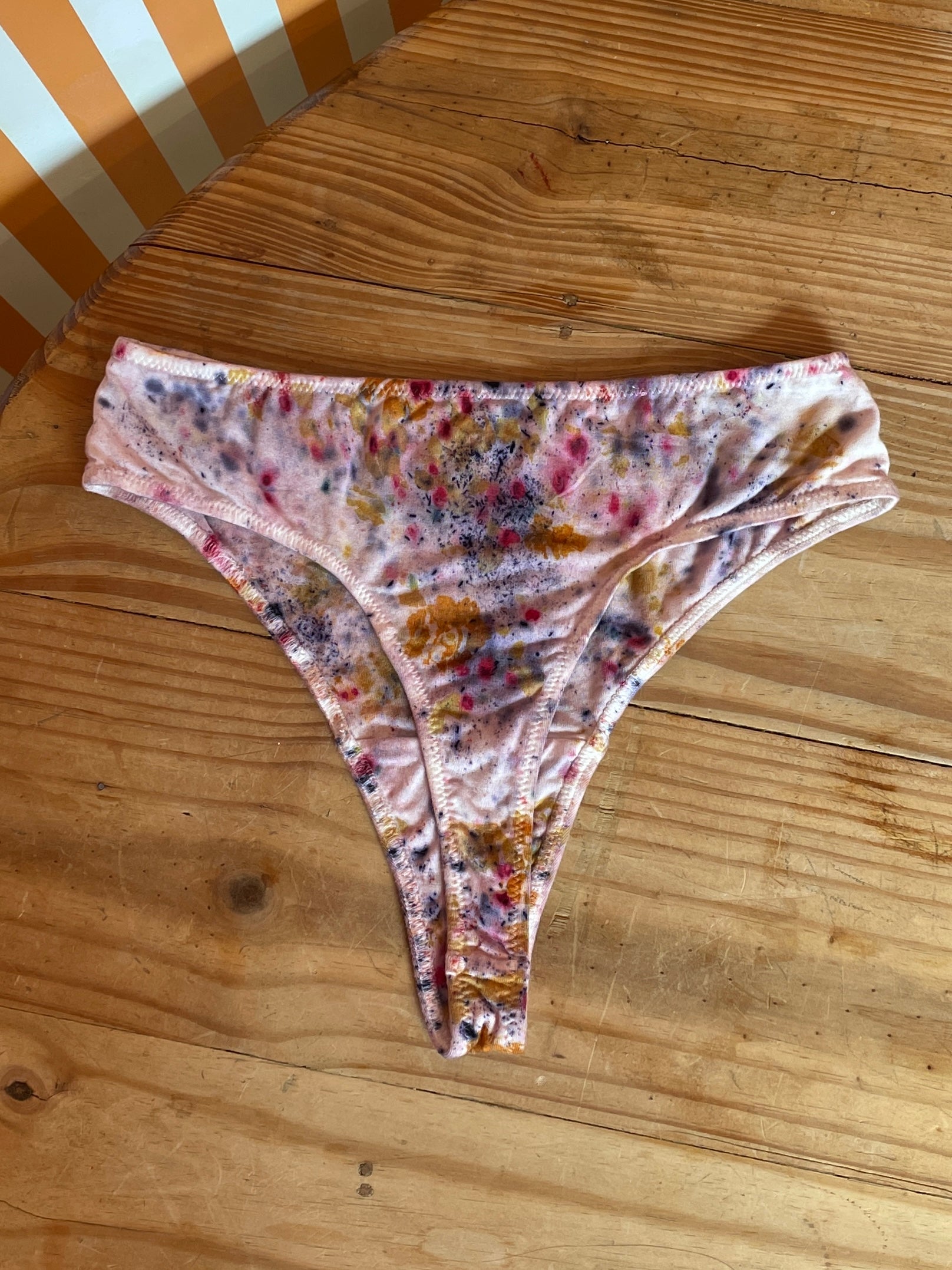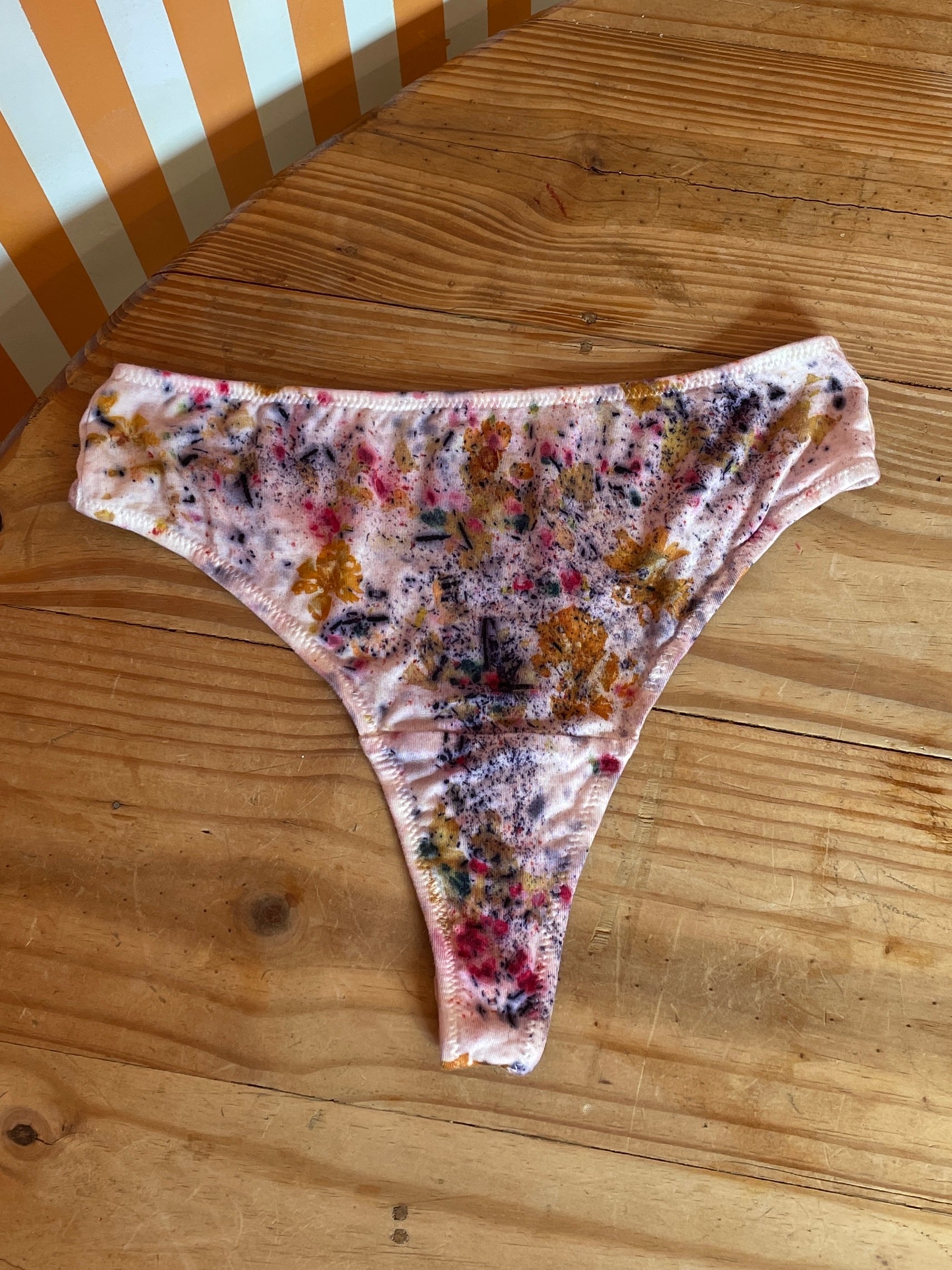 Each pair is eco-printed using real flowers, making every piece one of a kind. The photos shown represent the colors and design, but your underwear will be uniquely yours.