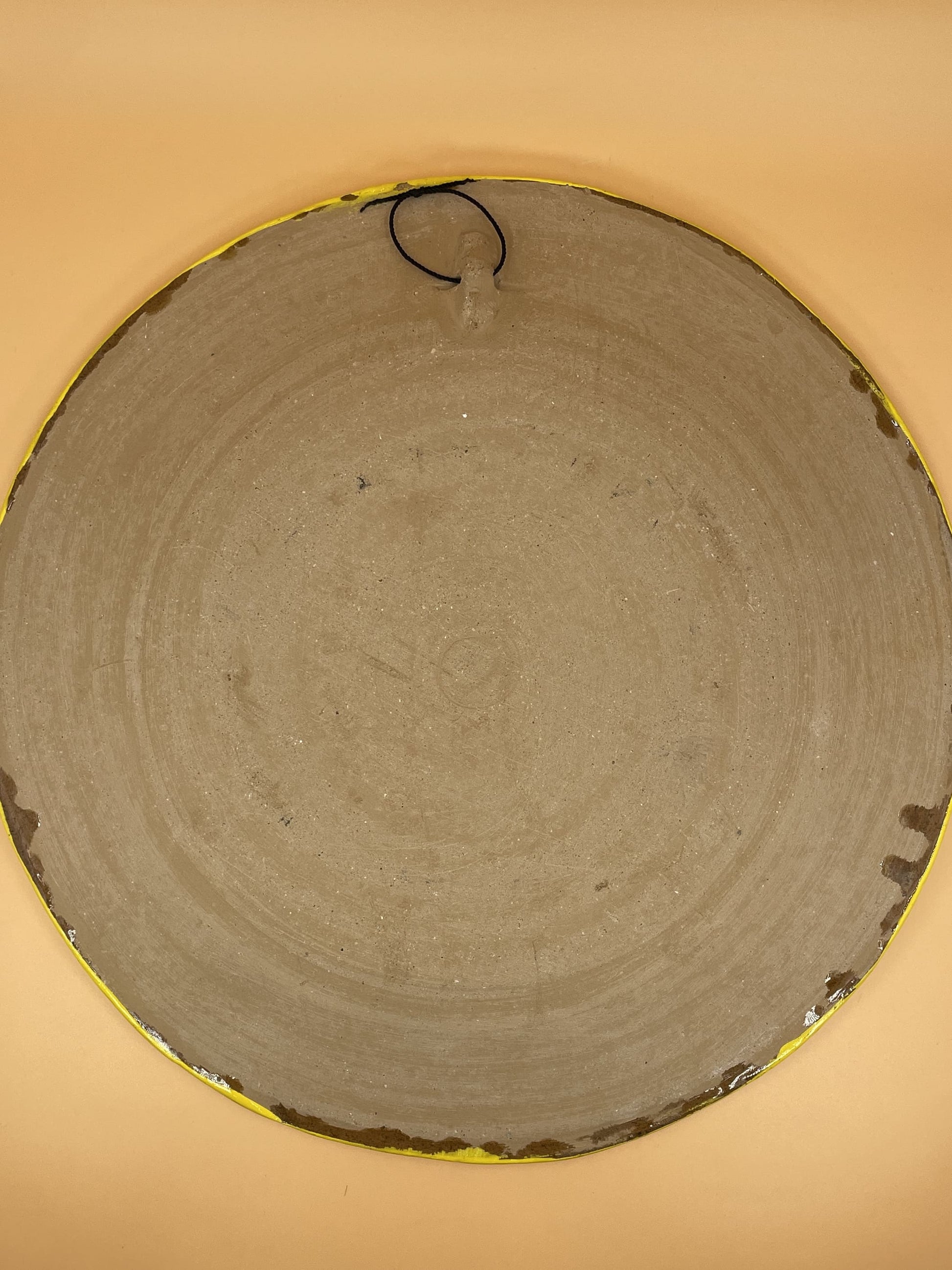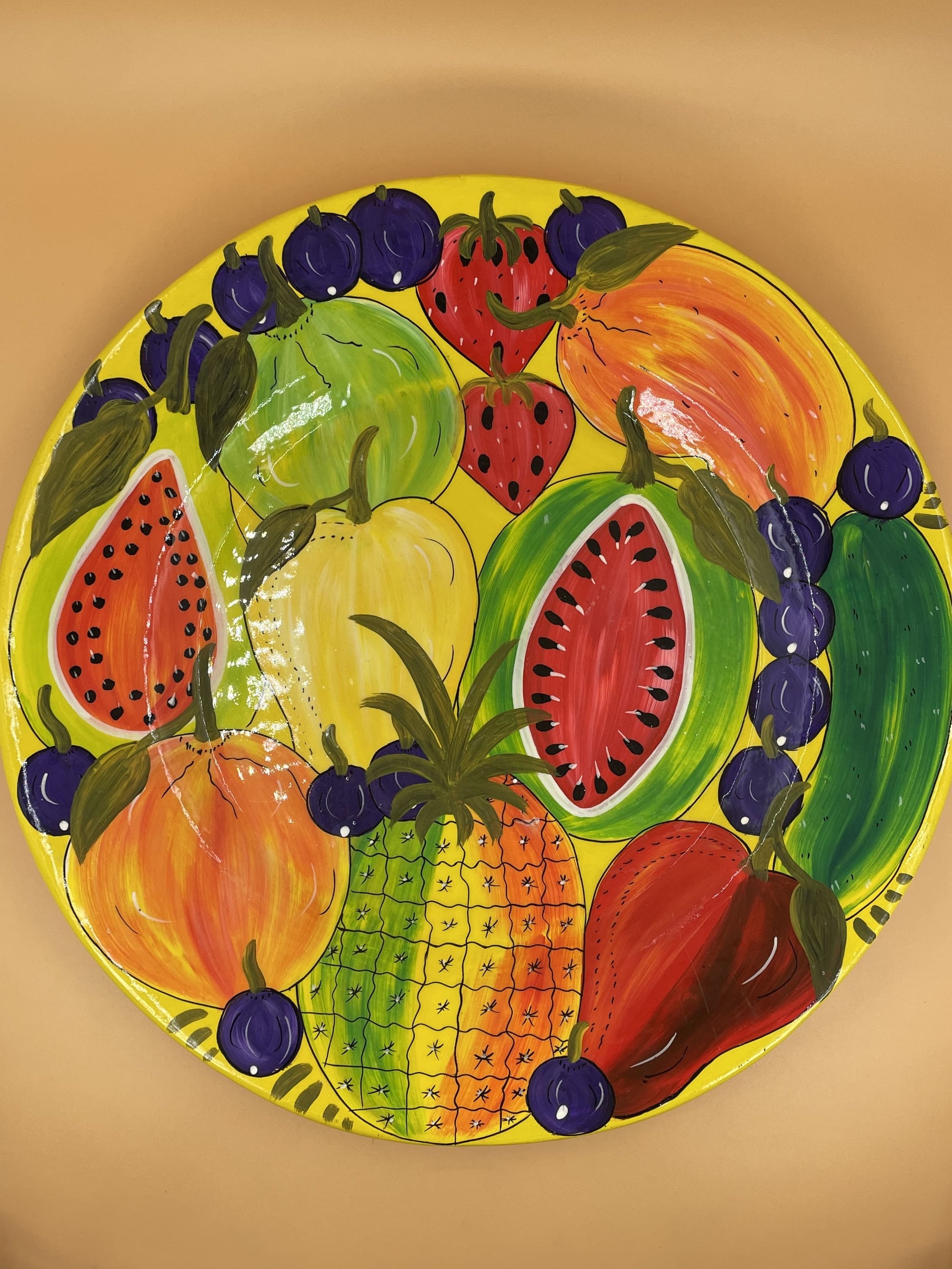 Hand-Made Painted Ceramic Yellow Serving Dish/Wall Hanging with Colorful Fruits