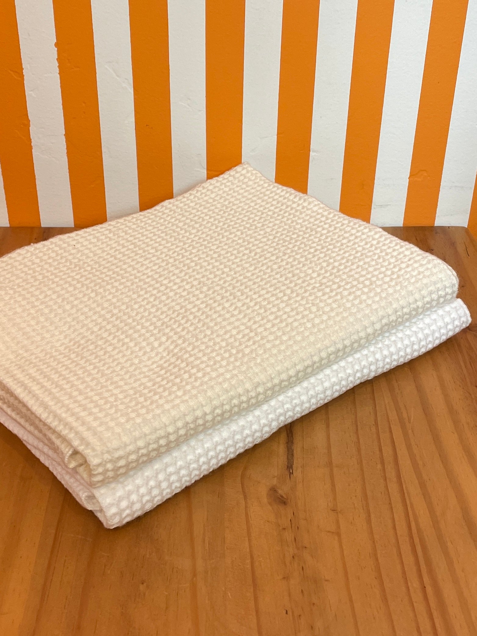 A set of 2 soft waffle weave kitchen towels in complementary shades. Super absorbent and quick to dry, you'll reach for them again and again.